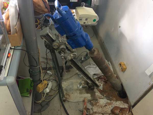 Технология бурения отверстий в стенах под углом к поверхности практически не отличается от прямого сверления. На станке закрепляется специальная буровая колонка, которая фиксируется под определенным углом, после чего устанавливается на поверхности и оператор проделывает отверстие нужного диаметра. Единственная разница заключается в старте – на первом этапе алмазные сверла не могут одновременно соприкасаться с поверхностью, поэтому давление на инструмент должно быть очень аккуратным. К преимуществам такого метода относится следующее: