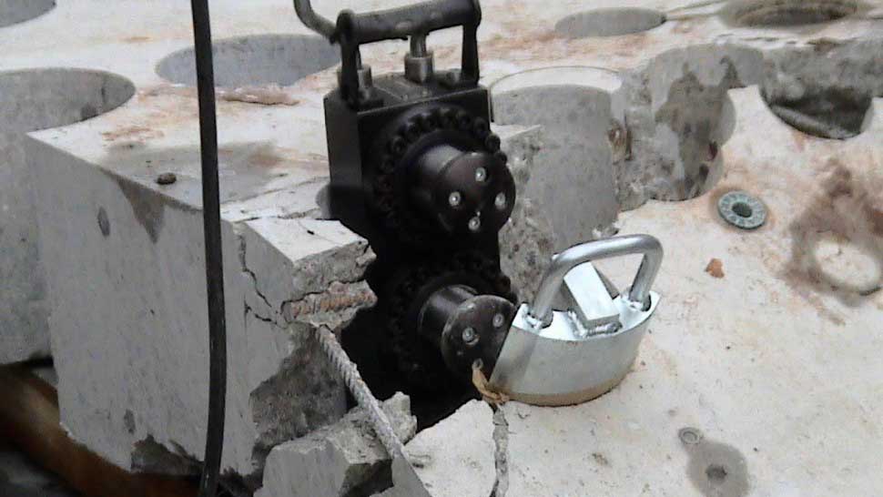 В бетонной конструкции сверлятся отверстия диаметром 30-40мм и помещается рабочая часть клина. При работе гидравлический клин создает необходимле усилие для разрушения бетона.