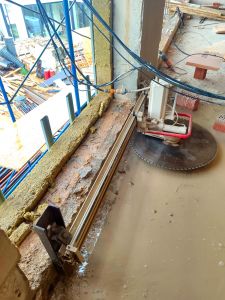 Когда основная резка была завершена, перед нами встала задача демонтажа. Вырезанная полоса длиной 15 метров весила немало. Поднимать её целиком было небезопасно и неудобно. Поэтому в ход пошел ручной алмазный резчик. Мы разрезали длинный фрагмент на удобные, компактные части, после чего аккуратно демонтировали их и спустили вниз.