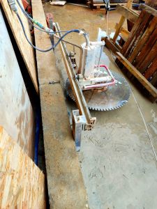 Таким образом, рельса оказалась жестко зафиксирована над линией реза, но при этом крепилась к «капитальной» части конструкции. Это позволило пиле пройти ровно там, где нужно, не рискуя обрушить оборудование.