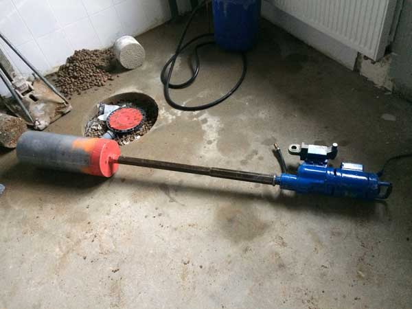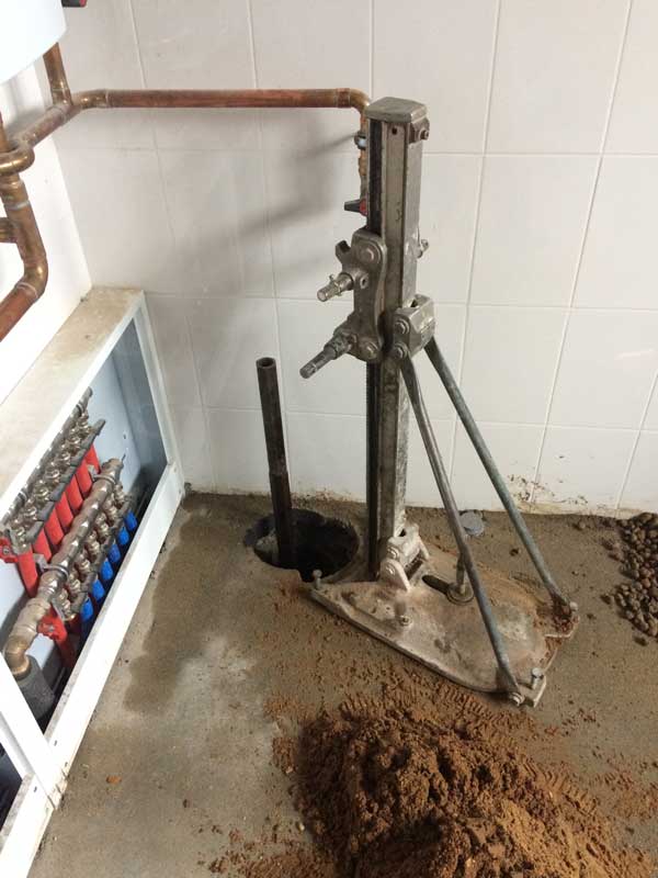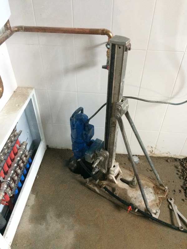 Процесс пробития отверстия в фундаментной плите под канализацию в частном доме в поселке "Красный Балтиец", Можайского р-на, Московской области методом алмазного бурения.