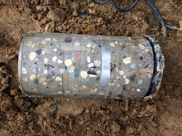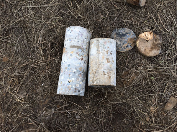 Выбуренные бетонные керны. Отверстие пробурено, общая глубина конструкции стены железобетонного коллектора составляет 870мм.
